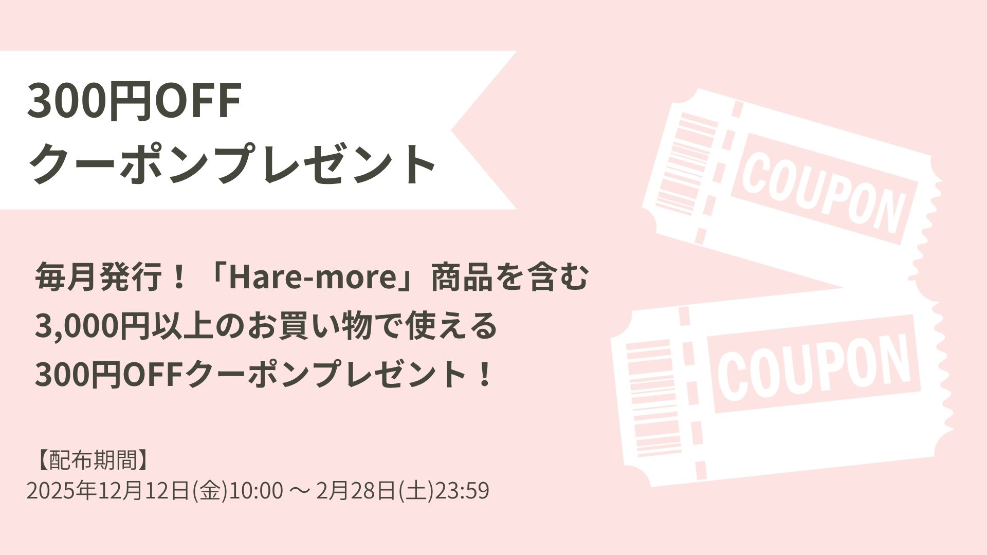 12月から2月まで毎月、「Hare-more」シリーズを含む3,000円(税込)以上のご購入で使える300円OFFクーポンをプレゼント!