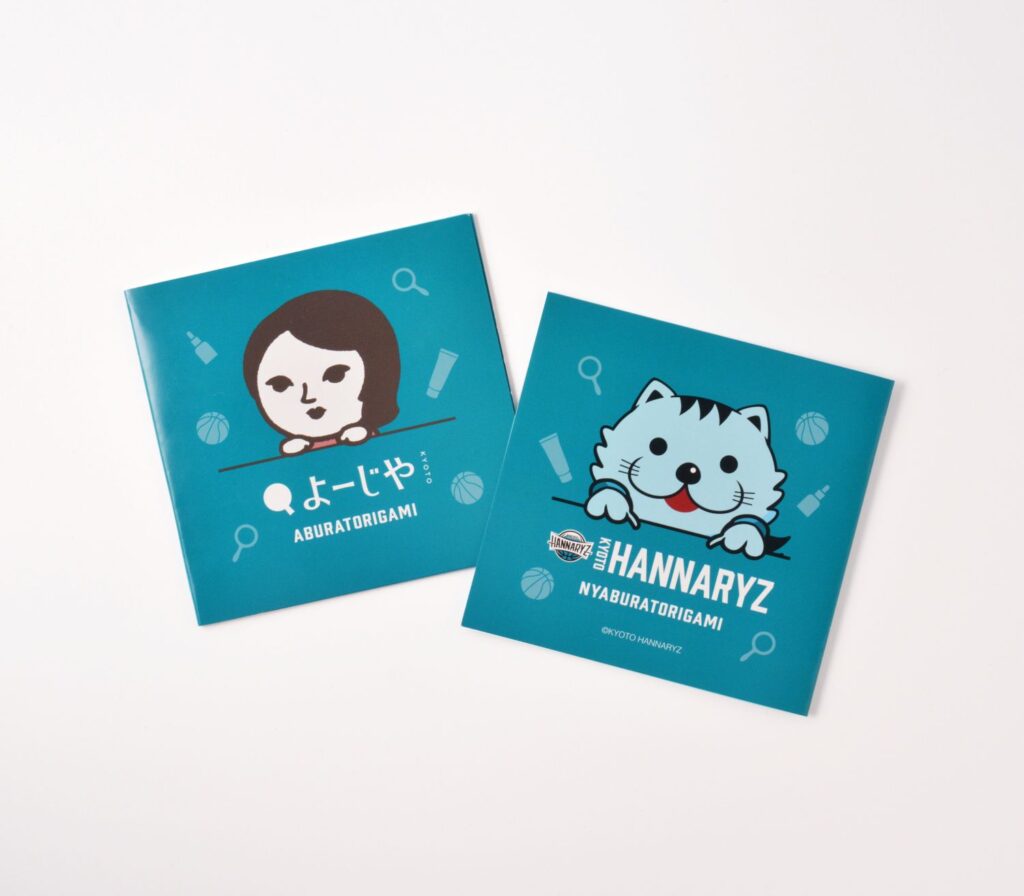 コーポレートキャラクター「よじこ」と京都ハンナリーズのマスコットキャラクター「はんニャリン」の初コラボデザインのあぶらとり紙です。