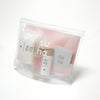 化粧水と乳液は、パウチ入りの美容液とコットンとともにスライダーポーチに入れて、